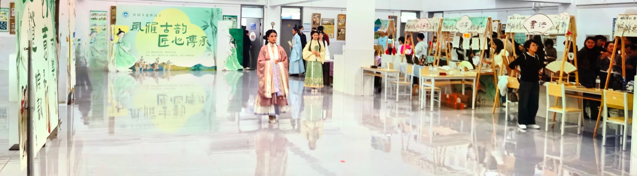 活动伊始,四场精彩展演接连亮相,为游园会拉开华丽序幕。“风雅开幕・古典舞” 率先登场,舞者身着水袖罗裙,身姿流转间如惊鸿照影,一颦一笑都透着东方美学的韵味;“华裳盛宴・汉服走秀” 紧随其后,曲裾的层叠庄重、马面裙的褶裥华美、披风的飘逸灵动,绣纹流转间尽显形制之美;“欢腾韵律・秧歌表演” 以红绸翻飞、鼓点铿锵点燃氛围,满溢民俗活力;“古韵余音・八角鼓表演” 以婉转唱词与灵动鼓点,传递传统曲艺的深厚底蕴,四场表演刚柔并济、雅俗共赏,瞬间将师生带入非遗文化的魅力之中。展演落幕,游园体验环节同步开启,各摊位宛如一幅非遗长卷徐徐展开,蜡染的蓝白雅韵、版画的刀刻匠心、非遗火腿的时间醇香、艾草系列的清新药香交织弥漫;国画的笔墨意境、漆扇的流光溢彩、螺钿的星河璀璨令人流连;文创产品将传统元素融入现代生活,中药合香珠则串联起养生智慧与美学价值。十五项非遗及传统文化项目各具特色,师生们或驻足观赏、或亲手体验,在互动中领略传统技艺的精妙。